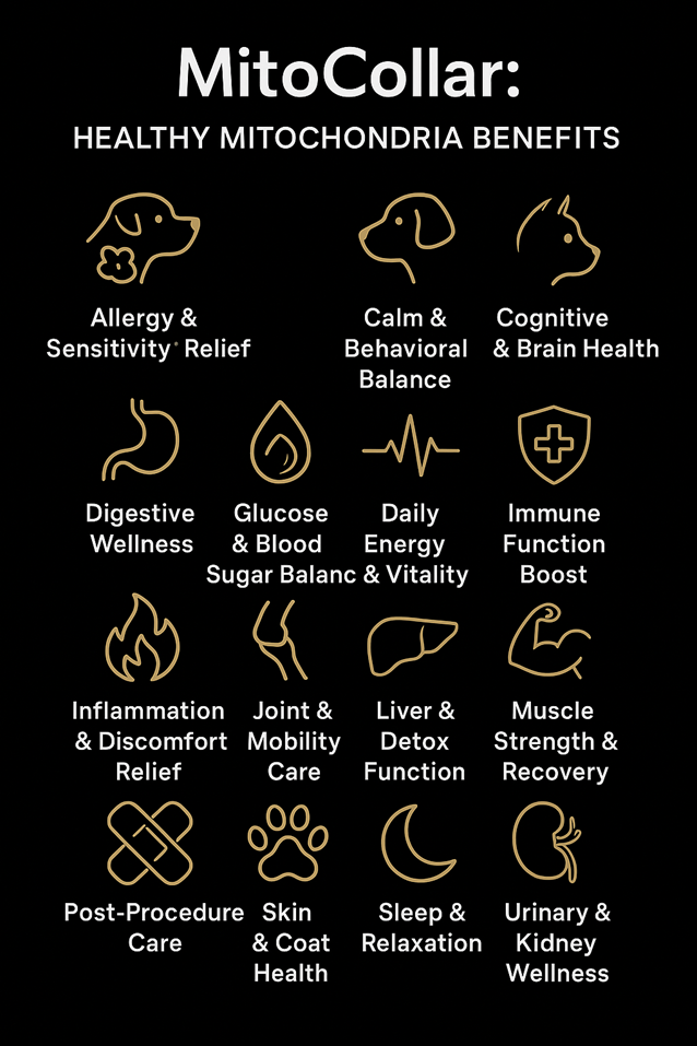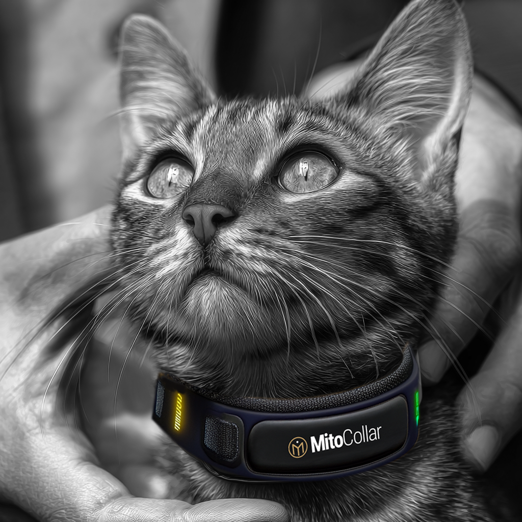 How Does It Work?The MitoCollar™ uses safe, low-level laser therapy to gently stimulate your pet’s mitochondria — the energy centers of their cells. This natural boost helps support healing, mobility, and overall vitality — so your pet can feel more energetic, more comfortable, and more like themselves again.